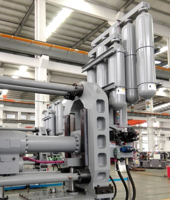 ①壓射系統:采用儲能器容量加大型設計,強化系統壓射性能,減少系統壓降;配置更粗大的壓射系統油管,通流能力更強,響應快速,且因壓力損失小,造成的油液升溫更小,能耗更低;拉桿加粗設計,確保剛性及模板平行度,增壓及壓射水平同向布局結構,提升壓射系統的穩定性。